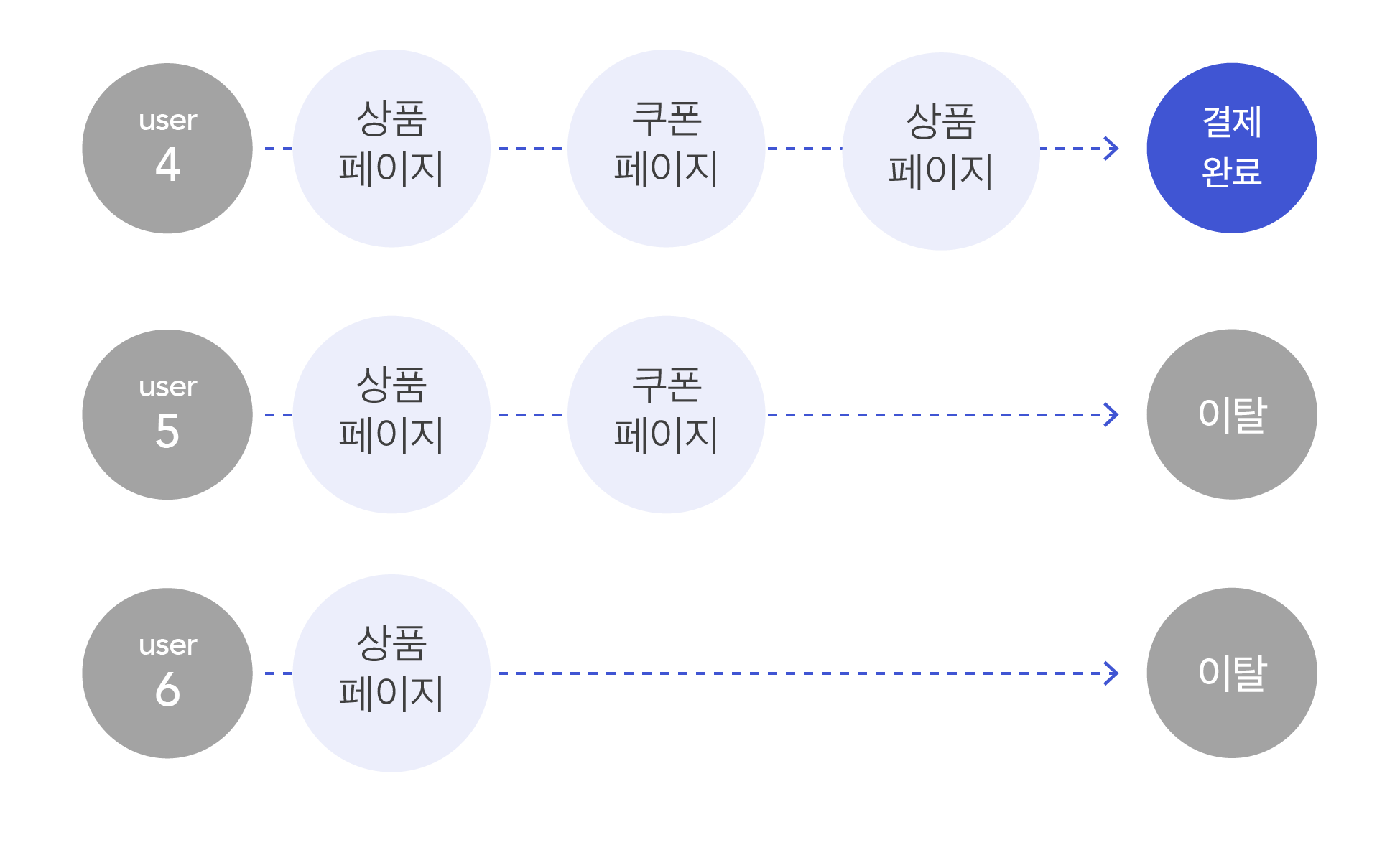 총 6명의 사용자가 상품페이지에 진입했는데, 결제 완료까지 전환된 사용자는 4명이다. 상품의 매력도가 높고, 전환율이 좋은 편이라고 볼 수 있다. 하지만 결제 프로세스를 개선하면 더 좋은 전환율을 기대할 수 있다.