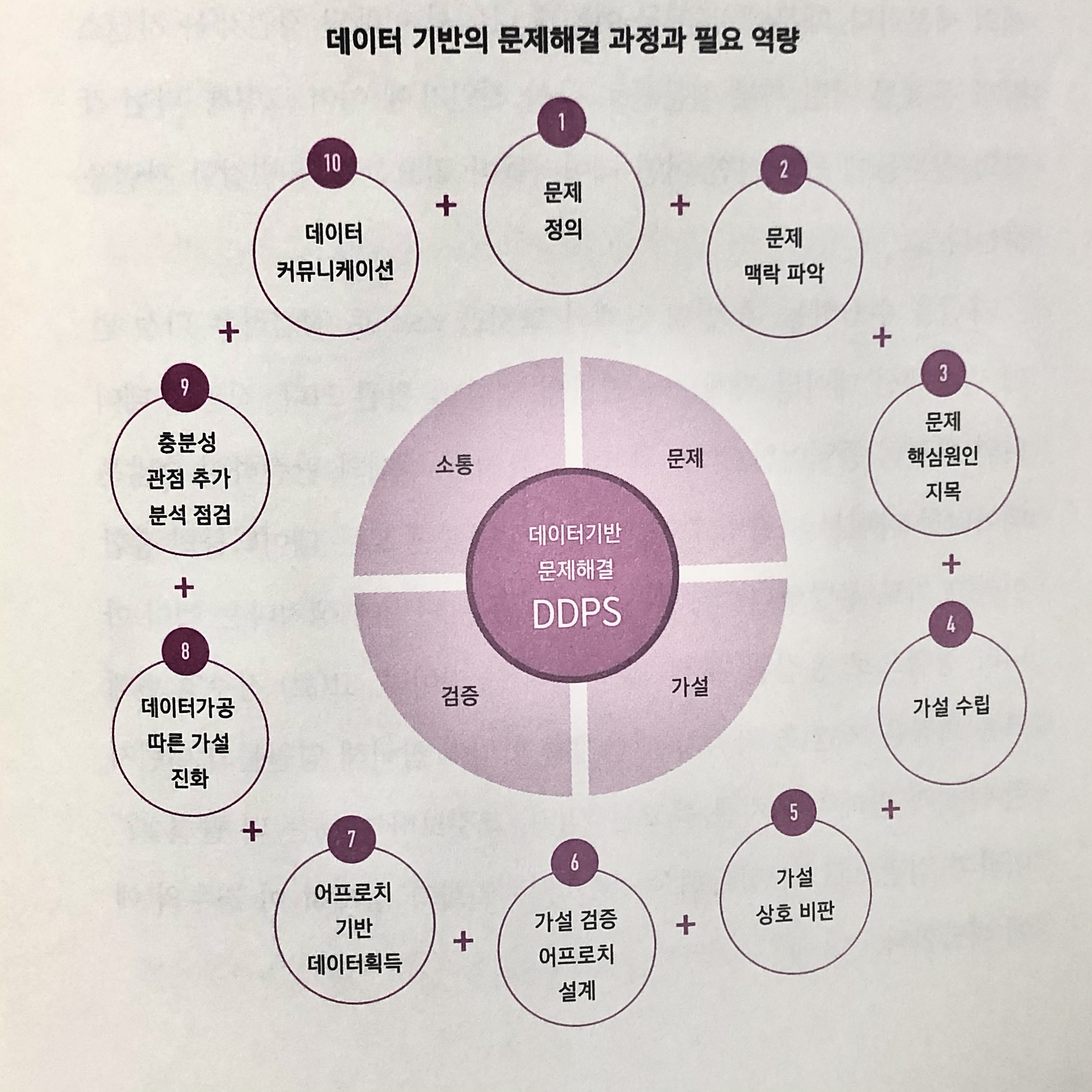 데이터 사고력과 연관되는 또 다른 것은문제 해결 역량이다. 일반적인 문제 해결 과정은 크게 '①문제 정의 > ②가설 수립 > ③가설 검증 > ④소통'의 순서로 진행된다. 다만 데이터 기반의 문제 해결 과정에선 직관이 아닌 데이터를 활용하는 만큼 이에 특화된 몇 가지 역량이 추가로 필요하다.