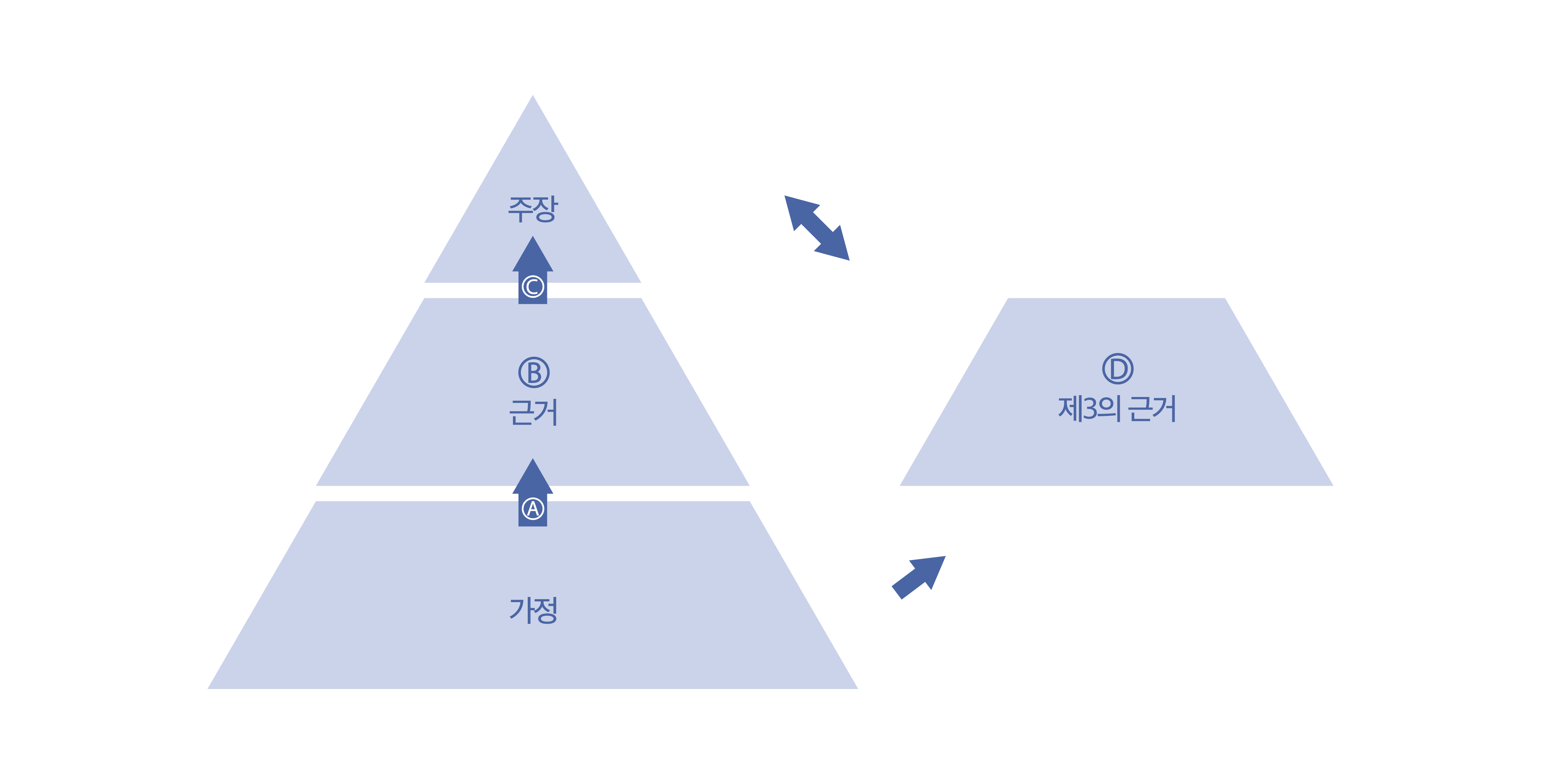위 그림에서 Ⓑ근거는 사실성과 연관성을 의미하며 Ⓓ제3의 근거는 충분성과 관련된 지점인데, 메시지 피라미드에서는 이 요소가 겉으로 드러나지 않기 때문에 포착하기 쉽지 않다. 설득하려는 사람 입장에선 자기도 모르게 무리한 가정을 근거로 삼고 있는 건 아니지, 또는 자신의 주장과 동일한 가정에 기반하고 있으나 혹 자신이 제시한 근거와 충돌하는 근거가 존재하진 않는지 항상 챙겨야 한다.