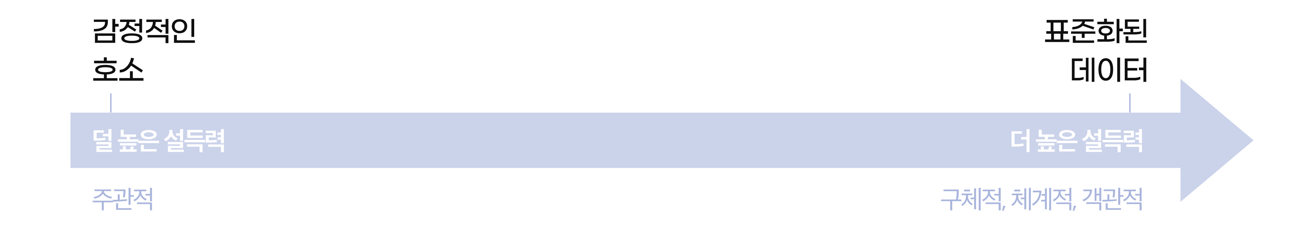 근거의 종류는 감정적인 호소부터 표준화된 데이터에 이르기까지 매우 다양한데 일반적으로 후자에 가까울수록 더 높은 설득력을 갖는다. 데이터는 생각의 관성에 변화를 주는데 아주 특별한 능력을 발휘한다. 데이터가 표준화될수록 구체적, 체계적, 객관적 정보라는 인상을 주기 때문이다. 뿐더러 정성적인 정보가 정향화 되려면 앞서 말한 조건들이 일정 수준 이상 확보되어야만 한다. 데이터는 근거의 사실성을 극대화한다. 직관에 따른 조준, 데이터가 뒷받침해주는 화력과 함께 한다면 늘 이길 수 있다.