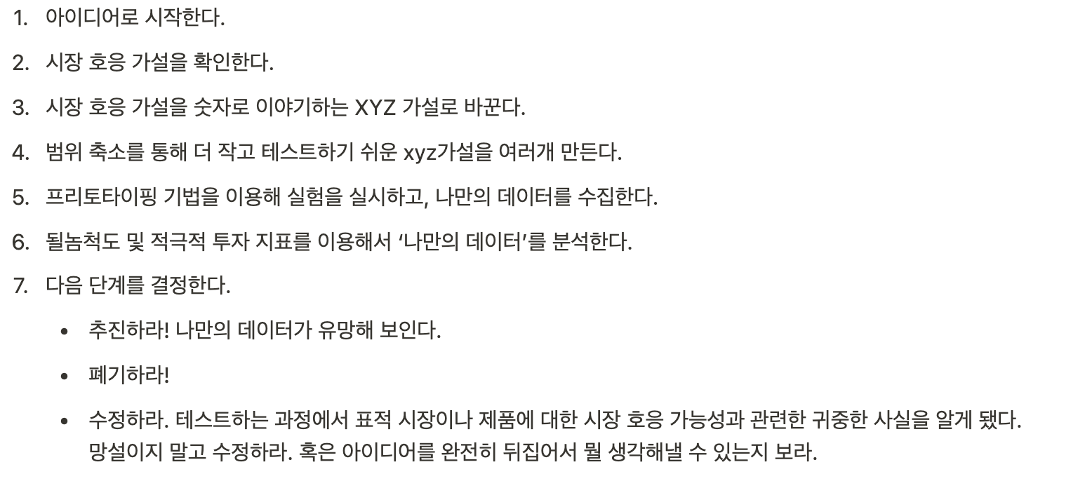 흔히 시장조사라 불리는 타깃 사용자의 의견과 생각은 믿을 만하고 객관적이고 활용할 만한 데이터가 아니라, 주관적이고 편향되고 오해의 소지가 있을 수밖에 없다. 남들이 했던 것 혹은 하지 못했던 것에만 기초해서 아이디어에 대한 의사결정을 내려서는 안된다. 아이디어를 검증하기 위해 직접 시장에서 수집한 신선하고, 관련성이 깊고, 믿을 만하고, 통계적으로 유의미한 데이터가 필요하다.