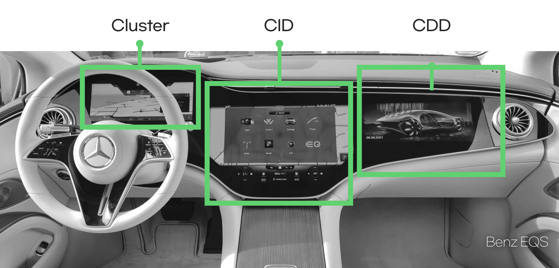 IVI 란, In-Vehicle Infotainment의 약자로, Infotainment는 차 안에서 즐길 수 있는 정보(Information)와 오락(Entertainment) 시스템을 의미해요. IVI에는 정말 다양한 디스플레이가 포함될 수 있어요. 대표적으로 'Cluster(클러스터/계기판)'와 'CID(Center Infotainment Display)'가 있습니다. 최근에는 벤츠 등의 브랜드에서 뒷좌석을 위한 인포테인먼트 시스템 ‘RSE(Rear Seat Entertainment)', '조수석 디스플레이 CDD'와 컨트롤 디스플레이(Control Display)도 함께 선보이기 시작했어요.