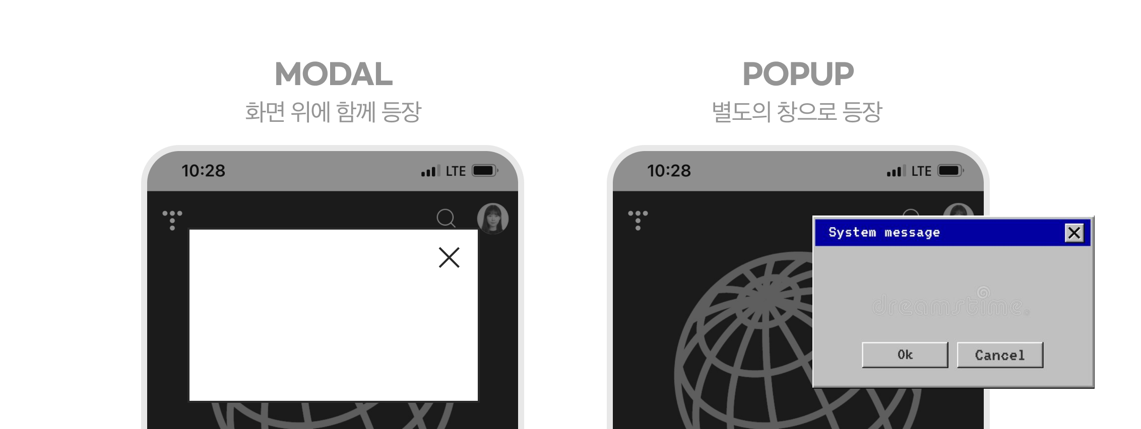 제일 흔하게 혼용해서 언급되는 모달과 팝업을 구분 지어볼게요. 모달과 팝업의 제일 큰 차이점은 '등장하는 방식'이에요.