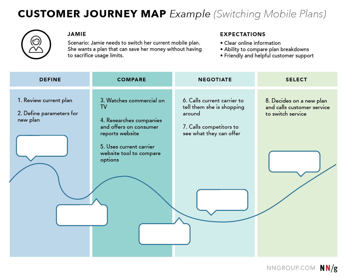 경험 지도(Experience map)는 일반적인 사람이 목표를 달성하기 위해 시작부터 끝까지의 경험을 시각화한 것입니다. 이 경험은 구체적인 비즈니스나 제품에 대해서는 무관심합니다. 오히려 일반적인 사람의 행동을 이해하기 위한 것입니다. (사용자 여정 그래프는 그 반대로, 더 구체적이고 특정 비즈니스와 관련되어 있습니다.)
