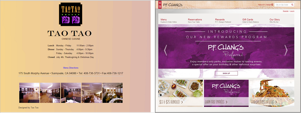 웹페이지에서 보고 느끼는 것과 페이지의 미학은 또한 웹페이지와 비즈니스에 첫인상을 남깁니다. 아래, 두 개의 다른 중국식당의 웹페이지를 확인할 수 있을 것입니다. 당신은 아마 웹페이지만 보고 두개의 중화 레스토랑 중 어떤 곳이 체인점인지 쉽게 확인할 수 있을 것입니다. 비록 사용자는 항상 의식적으로 이러한 추론을 공식화하진 않지만, 이러한 것은 안암리에 사용자의 행동과 사이트와의 인터렉션뿐만 아니라 회사에 대한 태도에 영향을 줍니다.