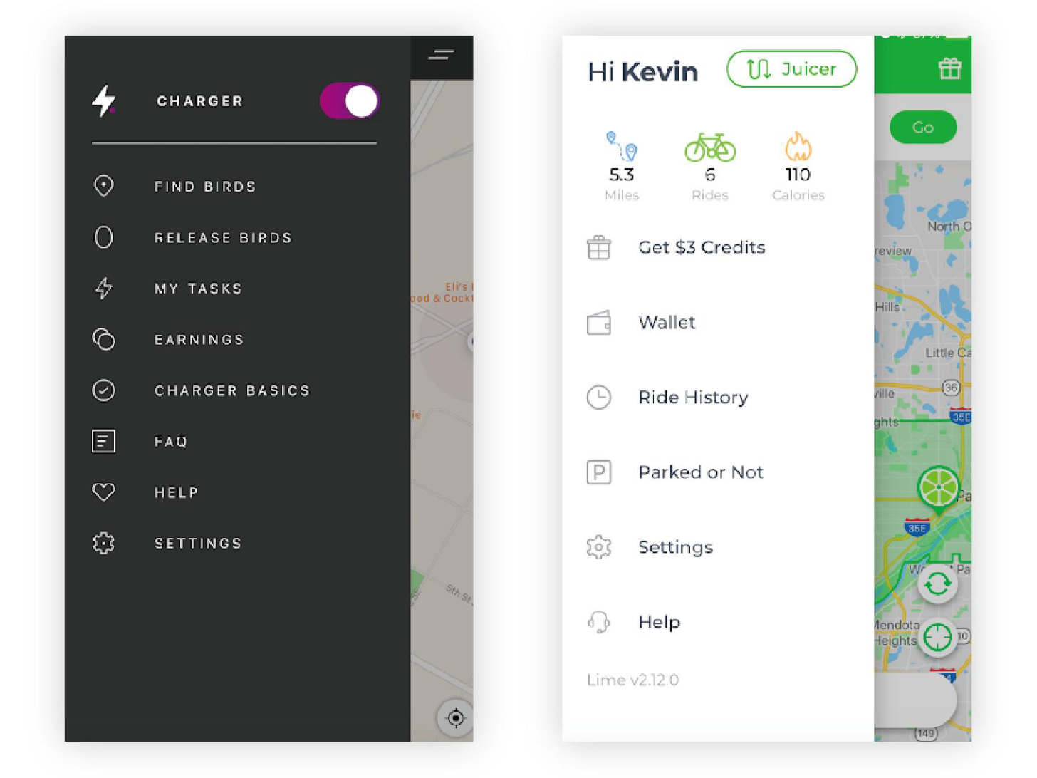 먼저, 라임이나 버드 앱에서 토글 버튼을 통해 차저(Charger) 모드(라임에서는 Juicer모드)로 변경합니다. Charger 모드가 되면, 충전이 필요한 스쿠터를 확인할 수 있습니다. 지역에 따라 특정 밤 시간에 한 번에 표시되기도 하고, 낮시간 중 충전이 필요한 킥보드가 지도에서 표시됩니다.