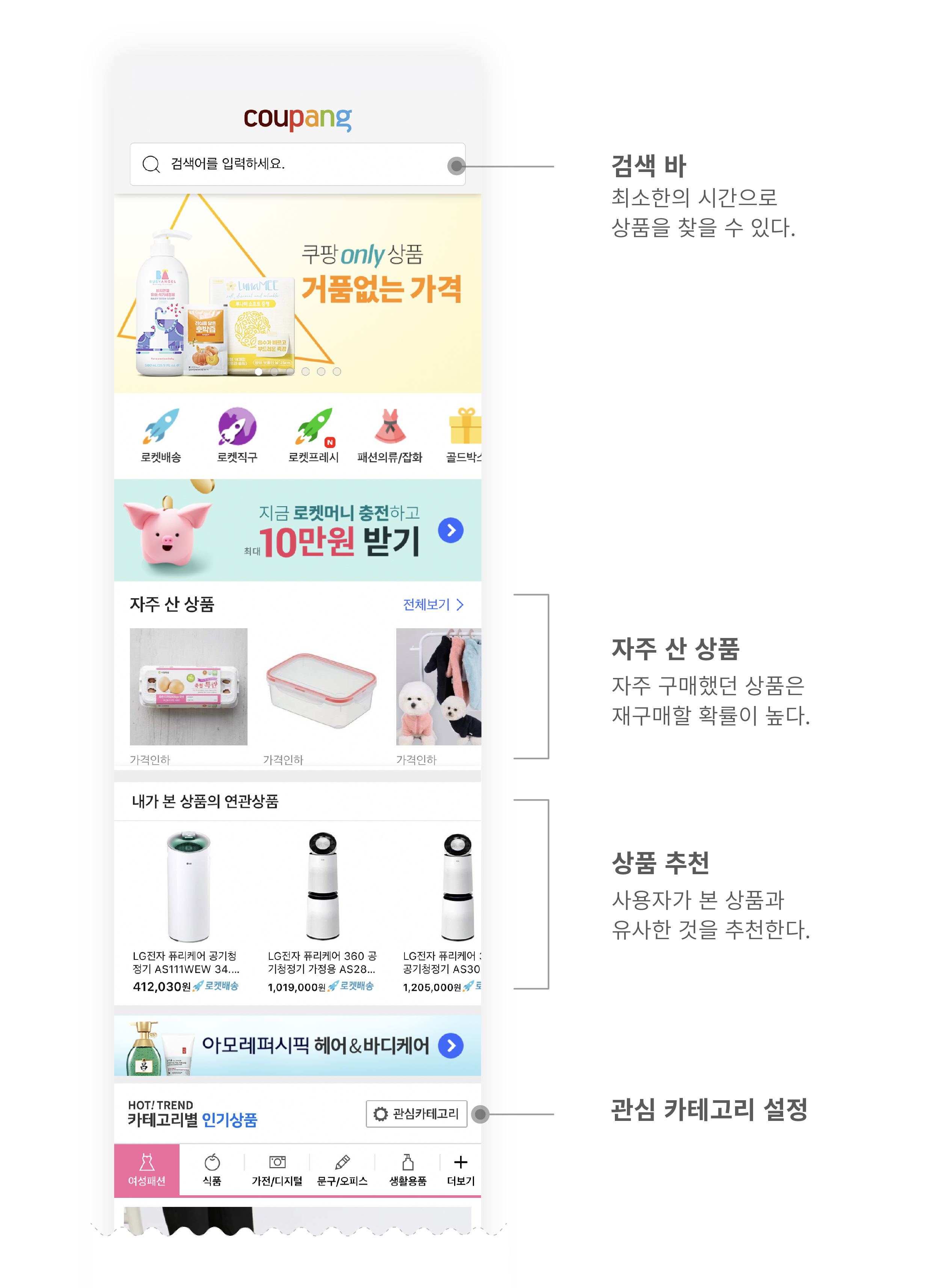 원하는 물건을 빠르게 탐색할 수 있는 ‘검색’기능을 가장 상단에 위치시켰다. 또한 사용자(소비자)를 위한 맞춤형 서비스를 강조했다. 자주 구매하거나 최근 본 상품과 연관된 상품을 추천해 줌으로써 효율적인 쇼핑에 큰 도움을 준다. 또한 관심 카테고리를 설정하여 상품을 추천 받을 수 있는데 이러한 화면 구성은 사용자를 흥미롭게 하고 구매를 이끈다.