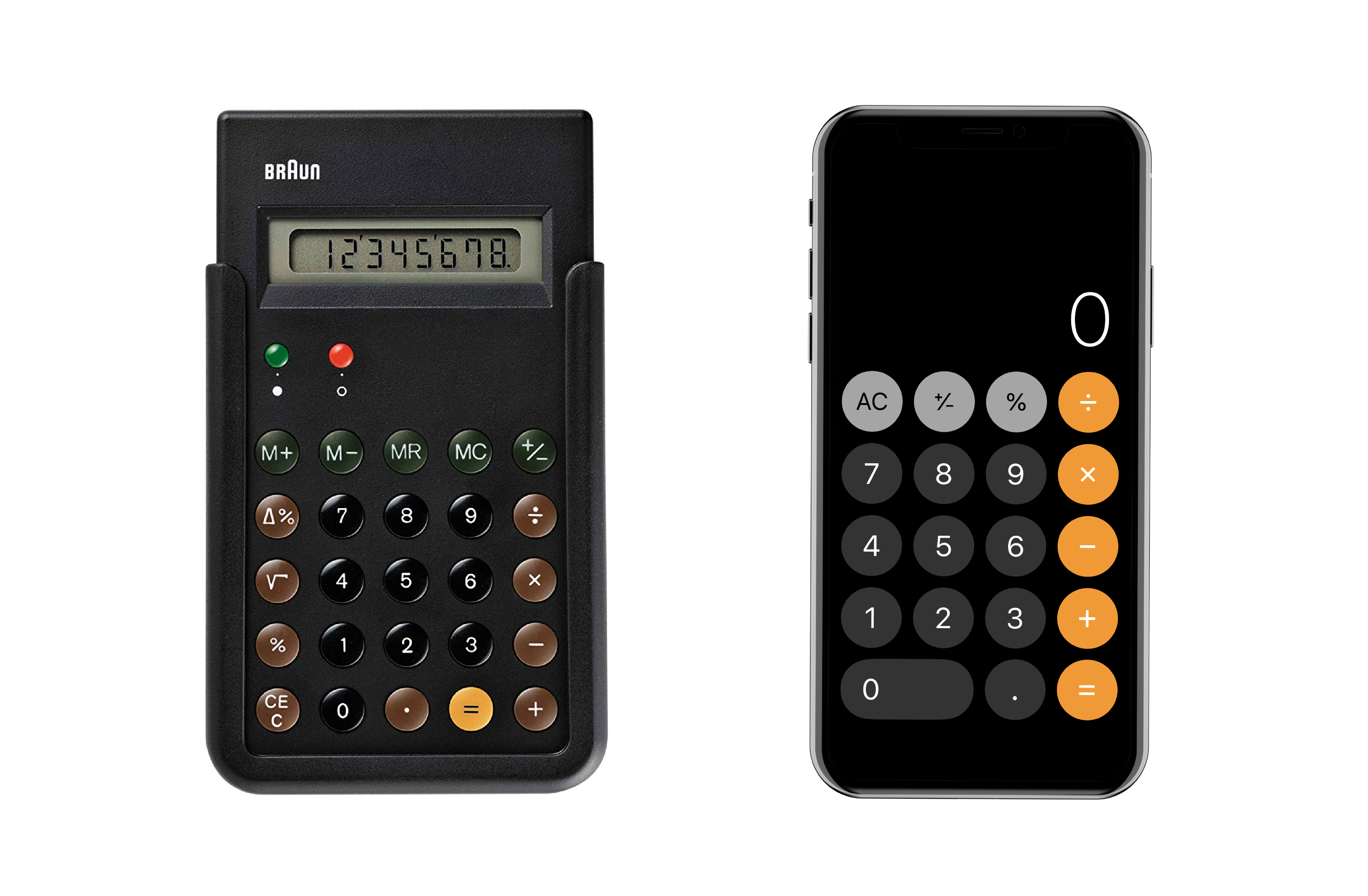 위 두 계산기는 왠지 모르게 닮았다. 실제로 애플사의 CDO(최고 디자인 책임자)인 조나단 아이브(Jonathan Ive)는 자신의 영감은 디터 람스로 부터 온다고 했다. 애플사의 아이팟, 아이폰 등과 그 속의 UI는 디터 람스의 디자인을 승계했다고 볼수 있을 만큼 유사하다. 처음 아이폰 계산기 앱을 사용할 때 굉장히 익숙하게 사용할 수 있었는데, 그 이유는 실제 계산기의 모습이 연상(Association)되 어떻게 사용하는 것인지를 파악(행동유도성/Affordance)할 수 있었기 때문이다.