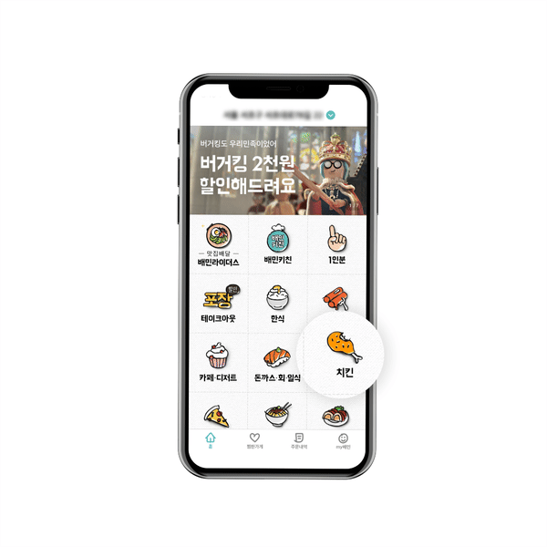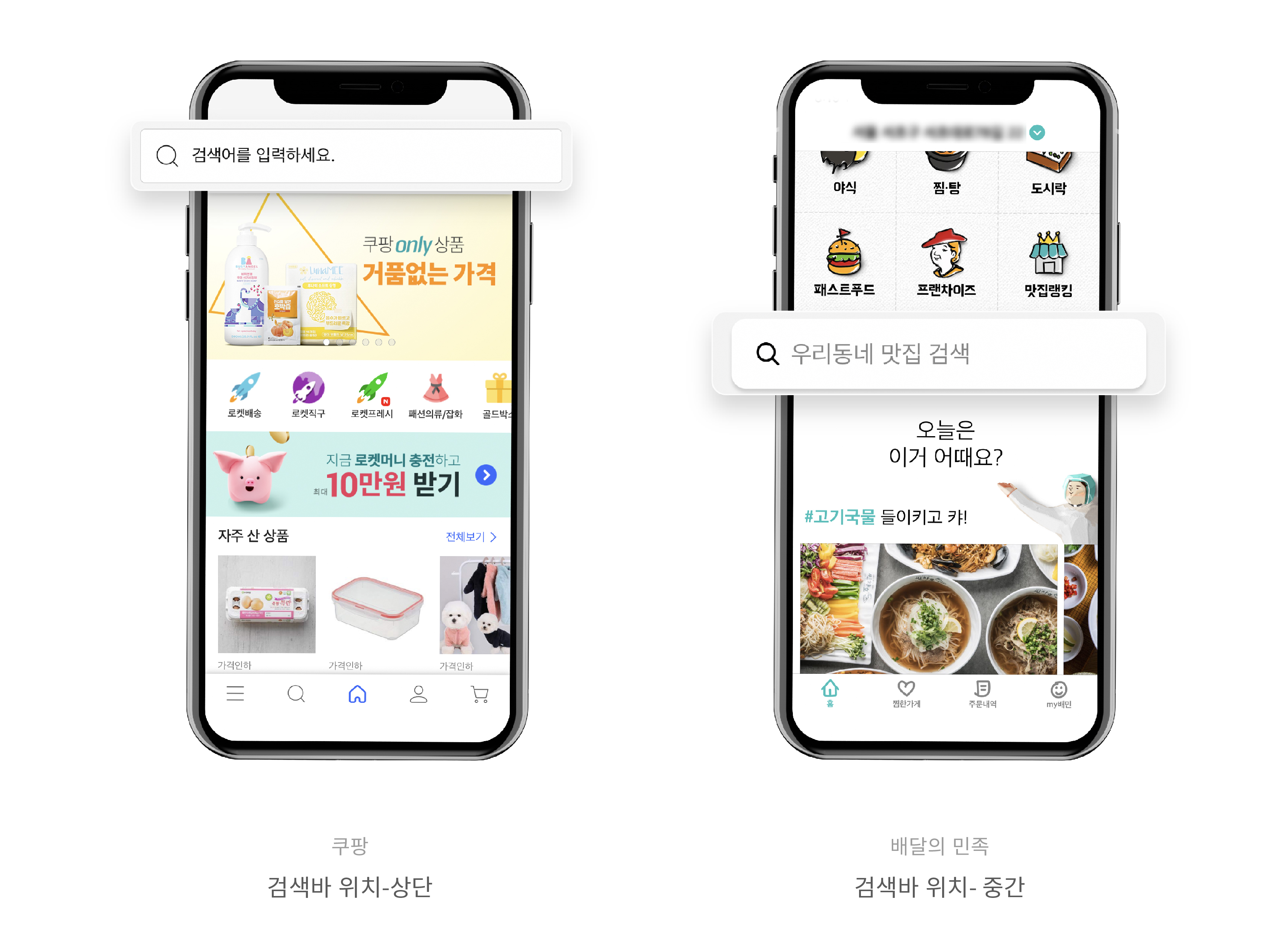쿠팡과 달리 배달의 민족은 검색 바를 상단에 두지 않았다. 카테고리를 먼저 보여주고 그중 선택을 못했을 때 검색을 할 수 있도록 검색 바를 배치시켰다. 우선 순위는 절대적이지 않다. 그렇기 때문에 UX/UI를 기획할 때 먼저 앱 서비스의 특징을 잘 고려해 우선순위를 정리해 보자.