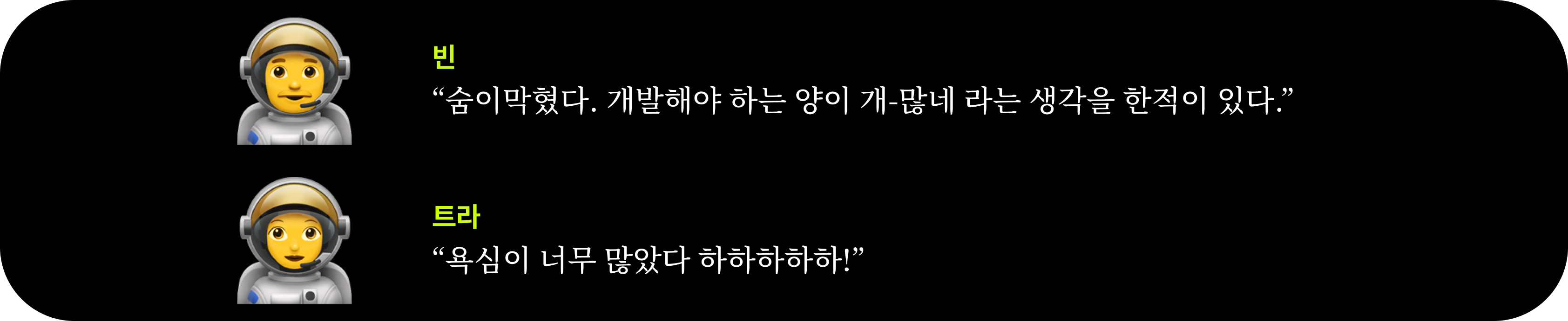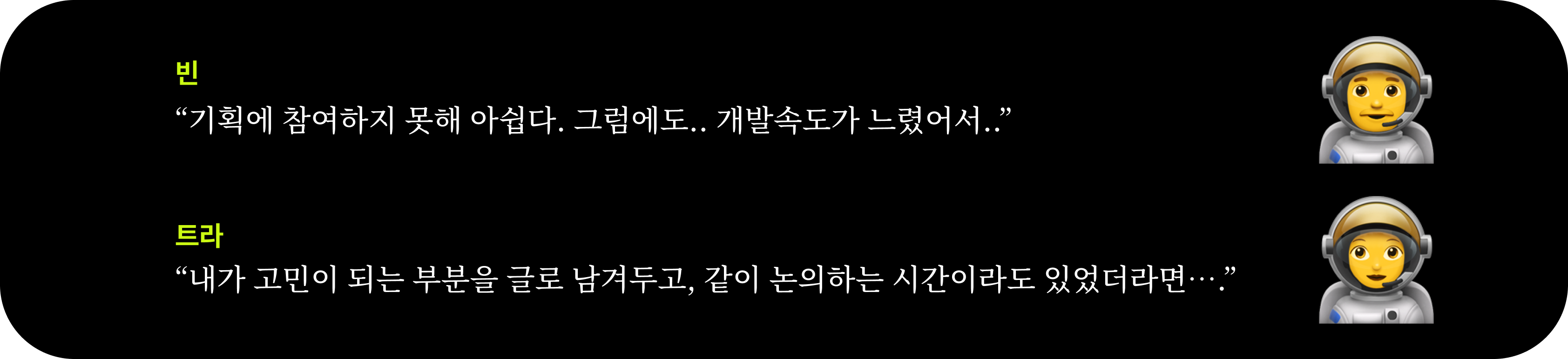 빈은 큰 회사에 다니며 기획에 적극적으로 참여하지 못했던 순간에 아쉬움을 느꼈다. 그래서 빈의 프로젝트 목표는 '개발자의 기획 참여'이기도 했다. 그런데!! 그의 생각과 달리 프로젝트를 진행하며, 기획에 대한 참여가 너무나 낮았다. 기획에 대한 참여도가 낮아지자 핵심정책에 대한 이해도가 낮아지기 시작했다. 어떤 문제 상황에서 시작되었는지 공유가 덜되어 기능의 필요를 공감하지 못하기도 했다.