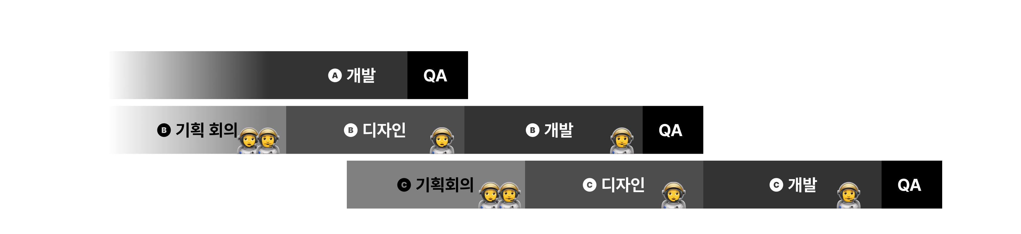 [ A 기획 회의 >> A 디자인] 후 빈이 A 개발을 진행되는 동안 트라는 [B 기획 회의 >> B 디자인]을 함께 진행하는 것이다. 자연스럽게 기획회의를 함께 하고, 디자이너가 다음 스프린트를 준비하는 구조가 되는 것이다. 중간중간 핸드오프 미팅을 진행하며 동시에 기획 미팅까지 진행한다면 자연스레 빈도 함께 기획하는 구조가 될 수 있으리라 생각한다.