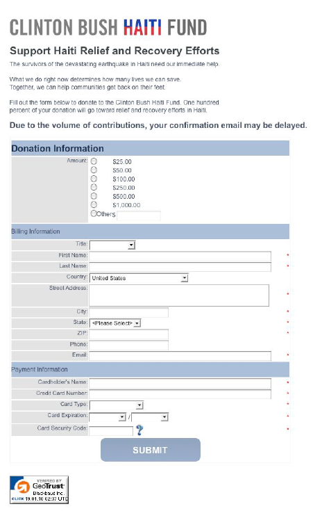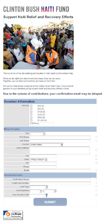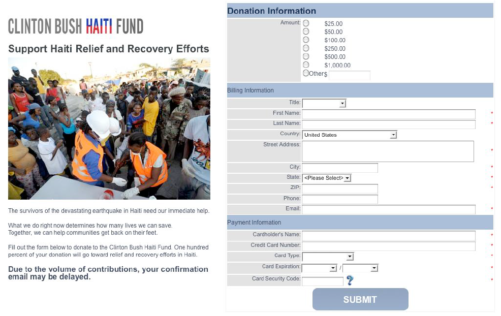 2010년 아이티에서 대지진이 일어나자 빠른 시일 내에 아이티를 지원할 기부금을 모아야 했다. 가능한 사이트를 방문한 많은 사람들이 많이 기부하게끔 하는 것이 클린턴 부시 아이티 지진 기부사이트의 목표였다.