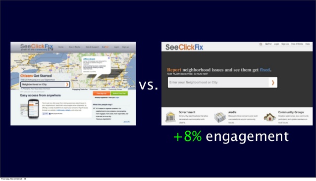 SeeClickFix팀은 새로운 디자인이 얼마나 훌륭할지를 평가하기 위해 A/B테스를 시작하였다. 그 결과는 놀라웠다.
