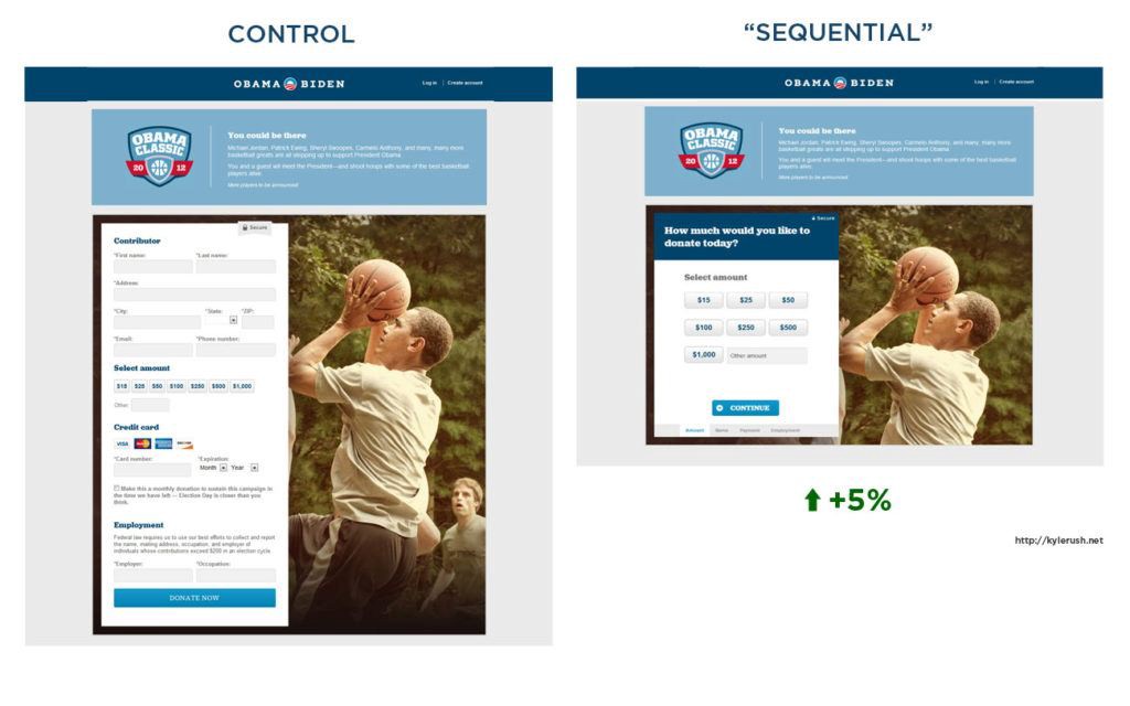 오바마 캠프 대선팀은 후원금을 얻기 위한 설문 폼이 너무 길어, 후원금을 놓치고 있음을 사용성 테스트를 통해 알고 있었다. 그래서 그들은 테스트를 진행한다.