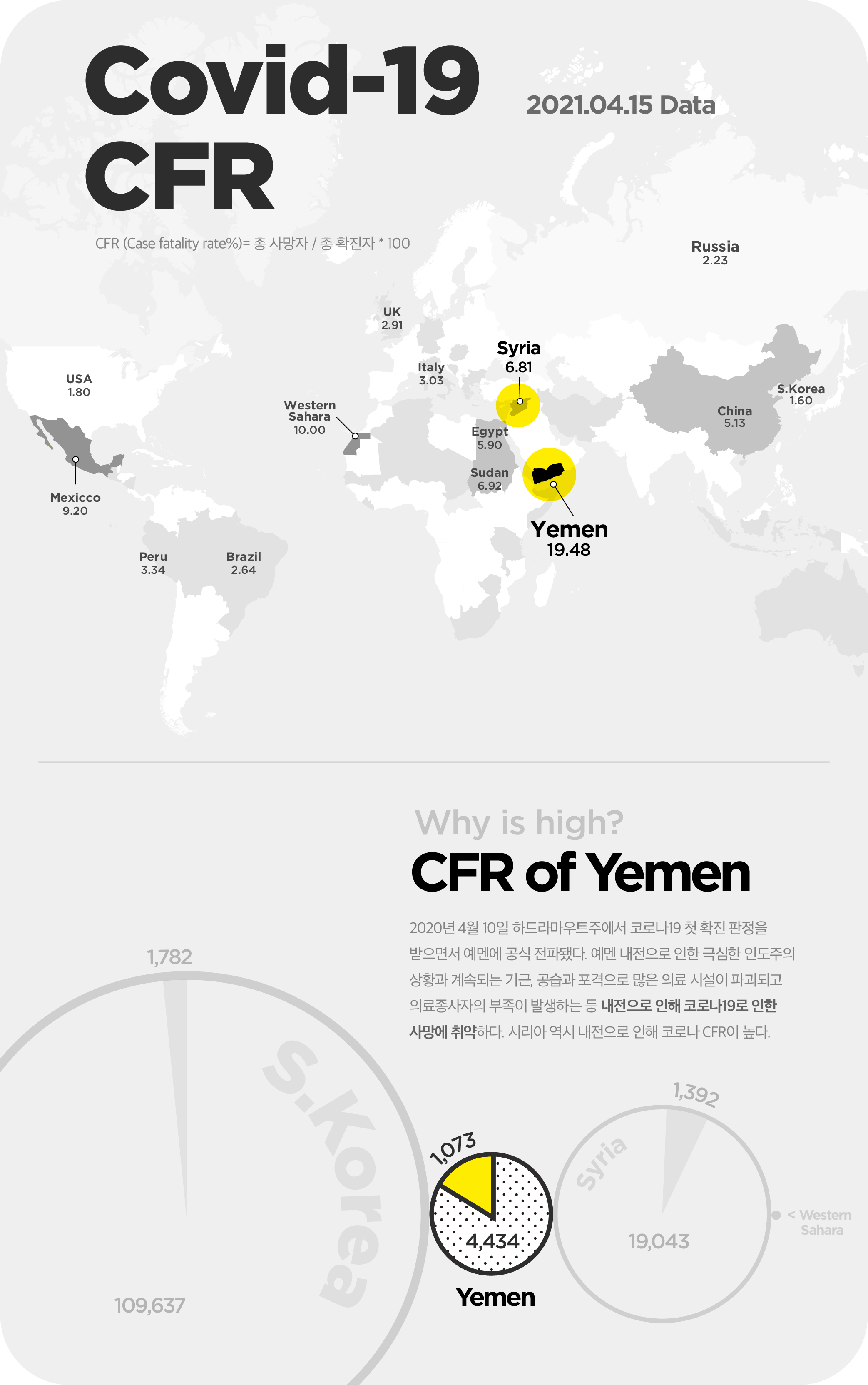 예멘은 2020년 4월 10일 하드라마우트주에서 코로나 19 첫 확진 판정을 받으면서 공식 전파됐다. 내전으로 인한 극심한 인도주의 상황과 계속되는 기근, 공습과 포격으로 많은 의료 시설이 파괴되고 의료종사자의 부족이 발생하는 등 코로나 19로 인한 사망에 취약하다. 시리아 역시 내전으로 인해 코로나 치명률이 높은 모습을 발견할 수 있다.