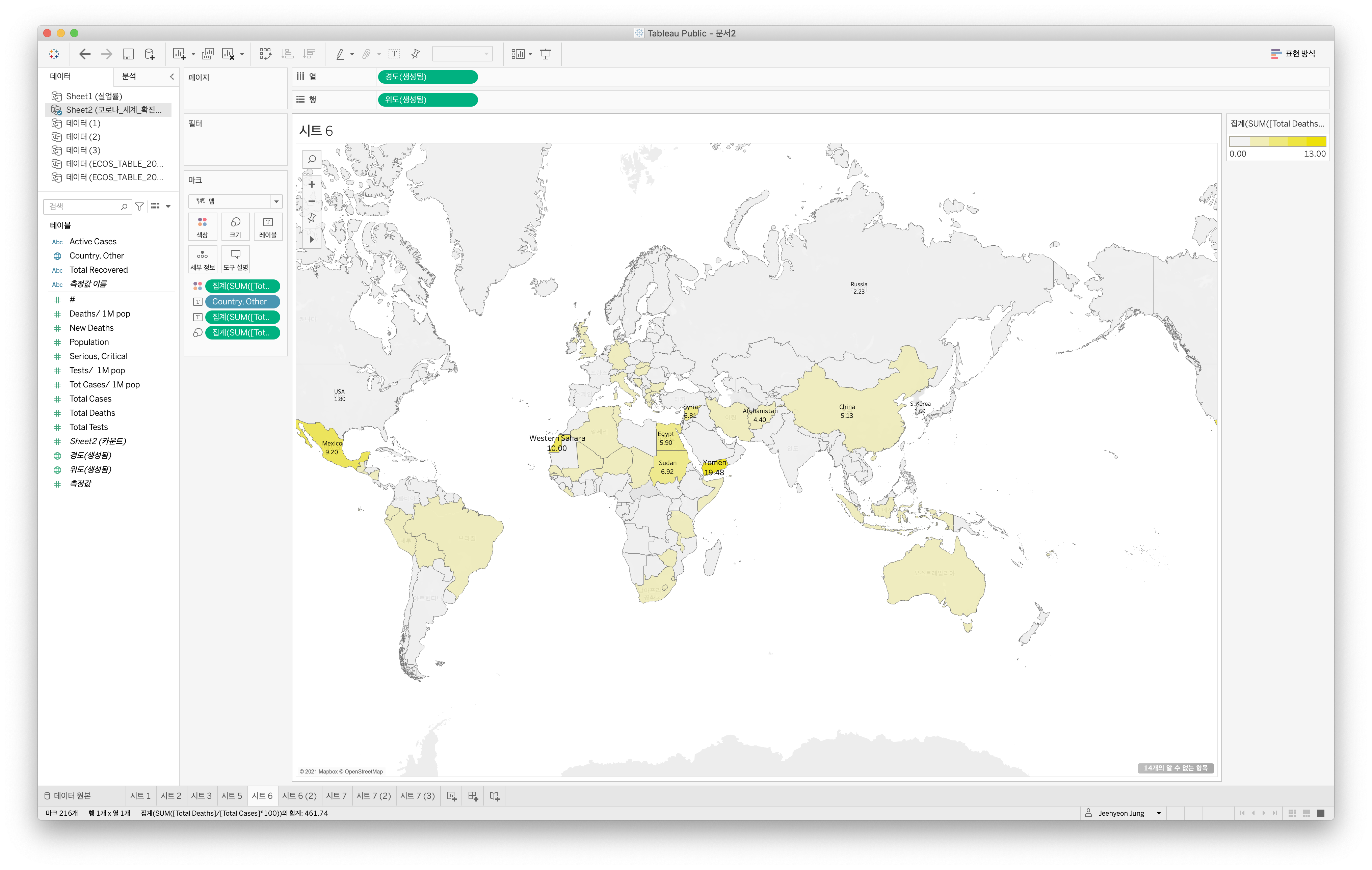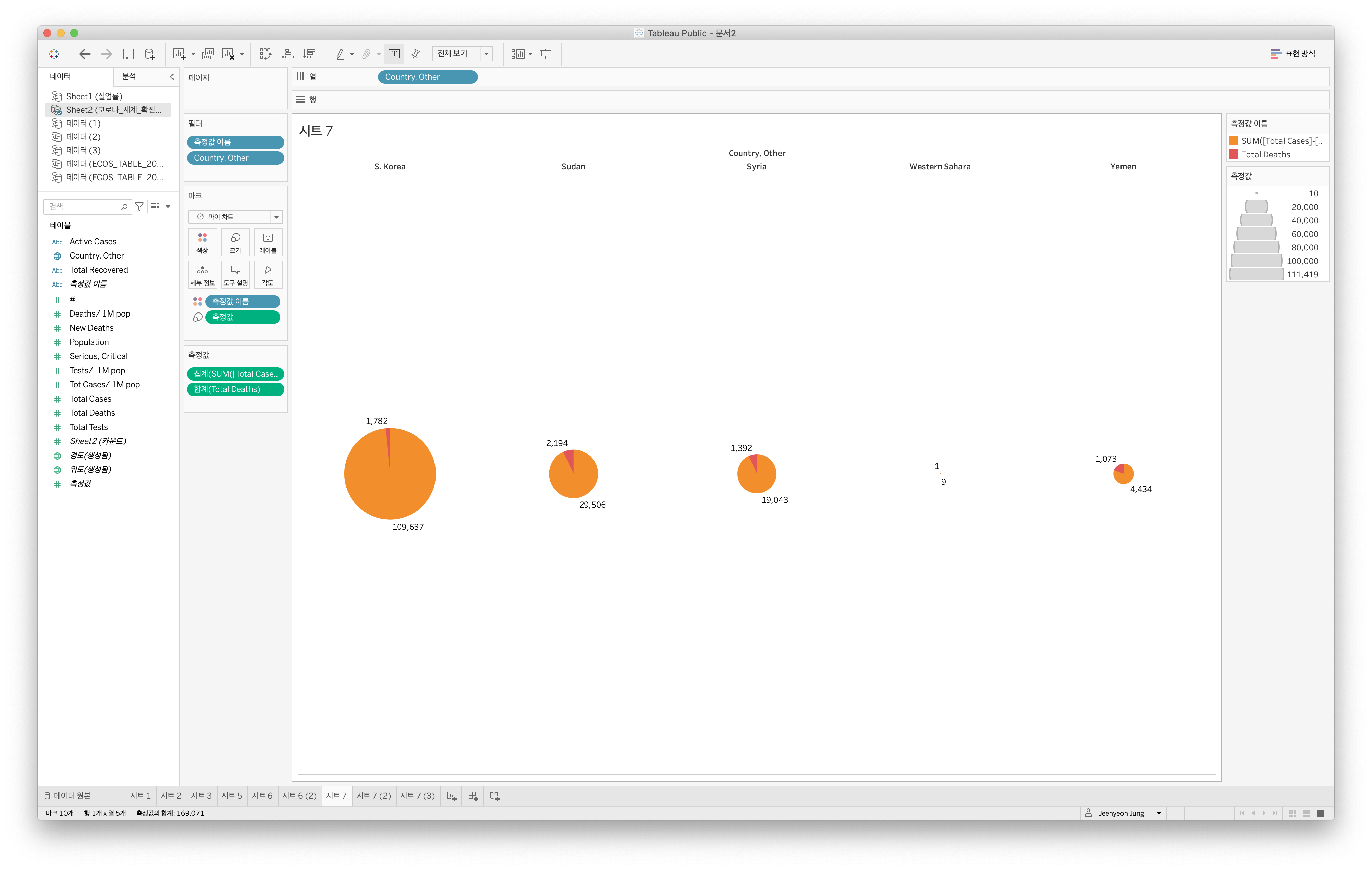 예멘의 CFR이 확진자 수 대비 타국에 비해 높음을 강조하기 위해 원형 차트를 사용했다. 더 강조하기 위해 우리나라와 비교했다. 사망하지 않은 누적 확진자 수(완치자+치료 중인 환자)와 누적 사망자 수를 원형 차트에 표현했다. 예멘의 확진자는 우리나라에 비해 적으나 사망자 수는 훨씬 높음을 확인할 수 있었다. 재밌었던 점은 '서사하라'의 CFR(10.00)이 굉장히 높아 함께 비교해봤는데, 누적 확진자 10명 중 1명의 사망자가 발생했기에 나온 데이터였다. CFR값만 봤다면 확인할 수 없던 데이터를 발견해서 너무 재밌었다!