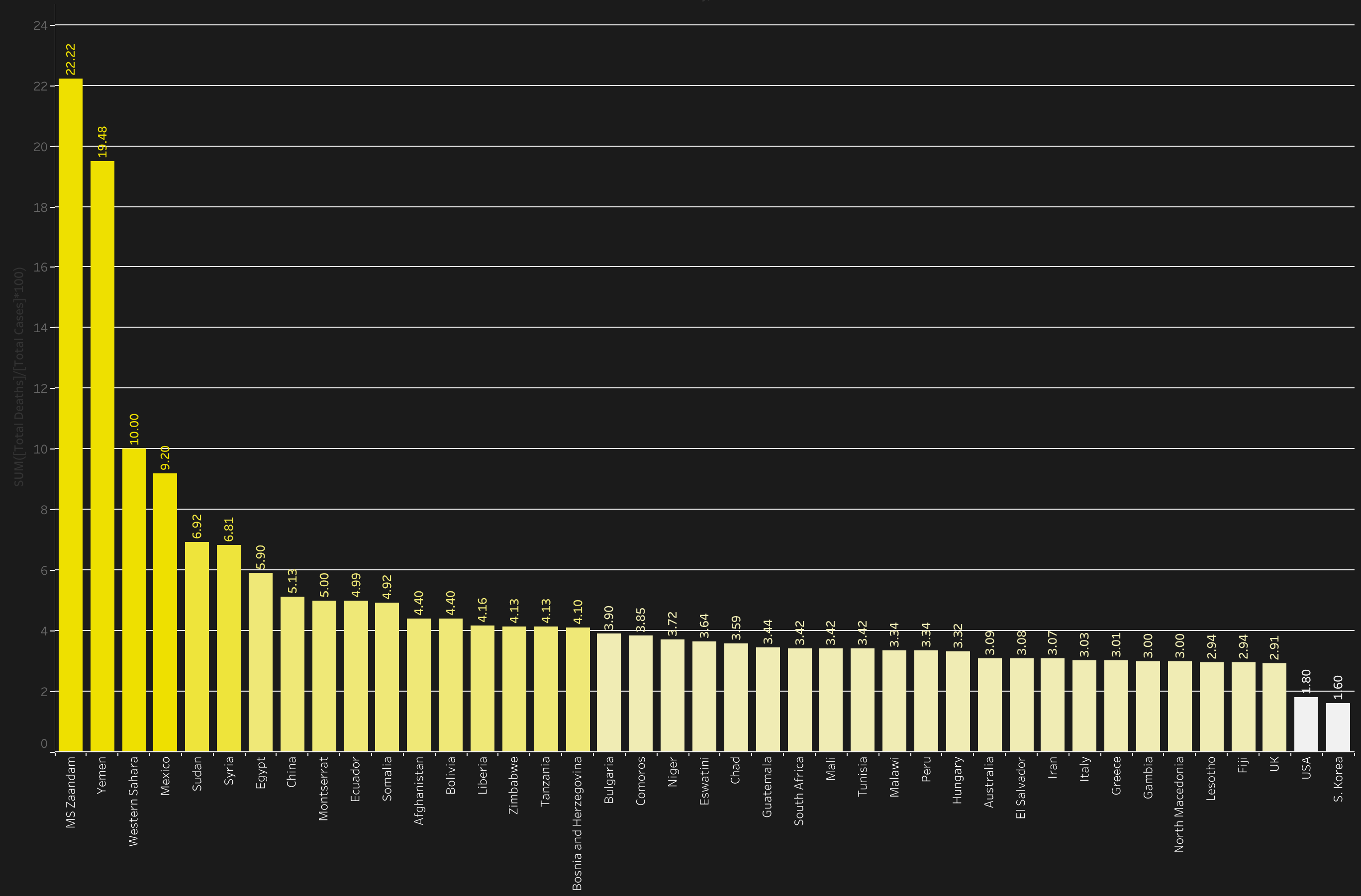 가장 높은 치명률을 지닌 예멘은 우리나라와 비교했을 때 적은 확진자 수(5,507)를 갖고 있다. 이는 우리나라보다 104,130명 적은 값이다. 하지만 사망자 수는 700여 명 정도밖에 차이가 나지 않는다.