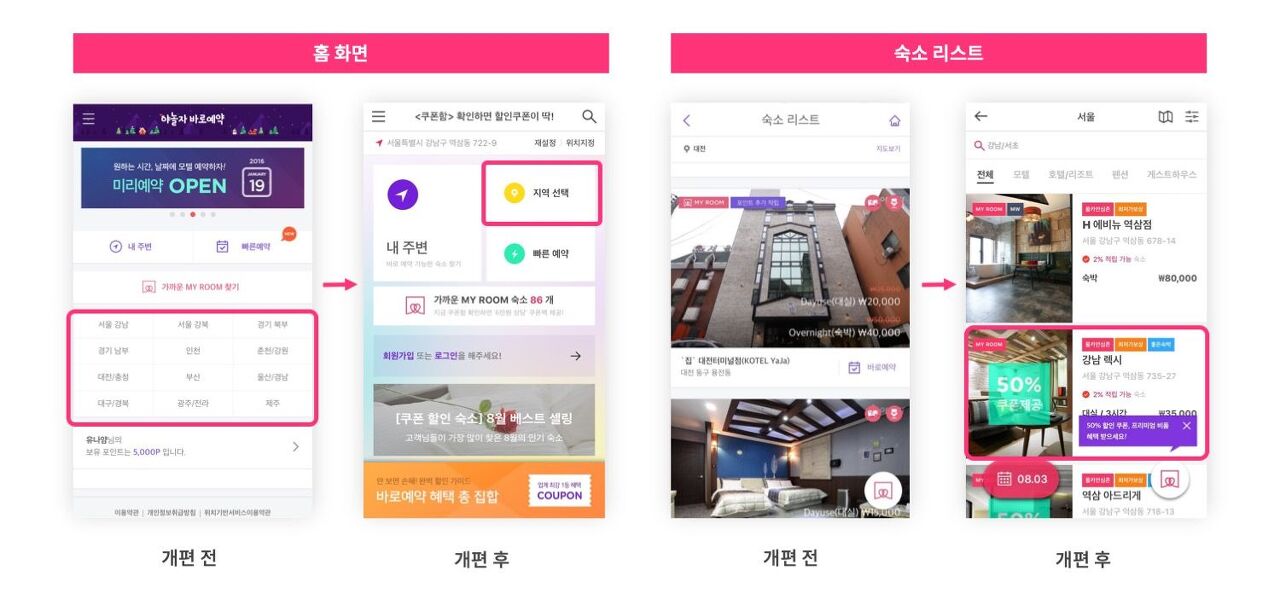 먼저 Persona의 앱 사용 목적/목표를 고려한 후 동일 크기로 구성되어 있던 버튼들을 우선순위에 맞게 크기와 위치를 수정했다. 시선을 분산시키는 지역명은 숨기고 내 주변에 있는 숙소 찾기(빠른 예약), 그리고 원하는 지역에 있는 숙소 찾기, 야놀자에서 특별히 진행하고 있는 MY ROOM 빨리 찾기 등의 메뉴에 중점을 둬 사용을 유도했다. 홈 화면에서 메뉴(앱 진입의 목적/목표)를 선택해 '사용자'의 목적/목표에 맞는 경험을 성공적으로 유도한 셈이다.