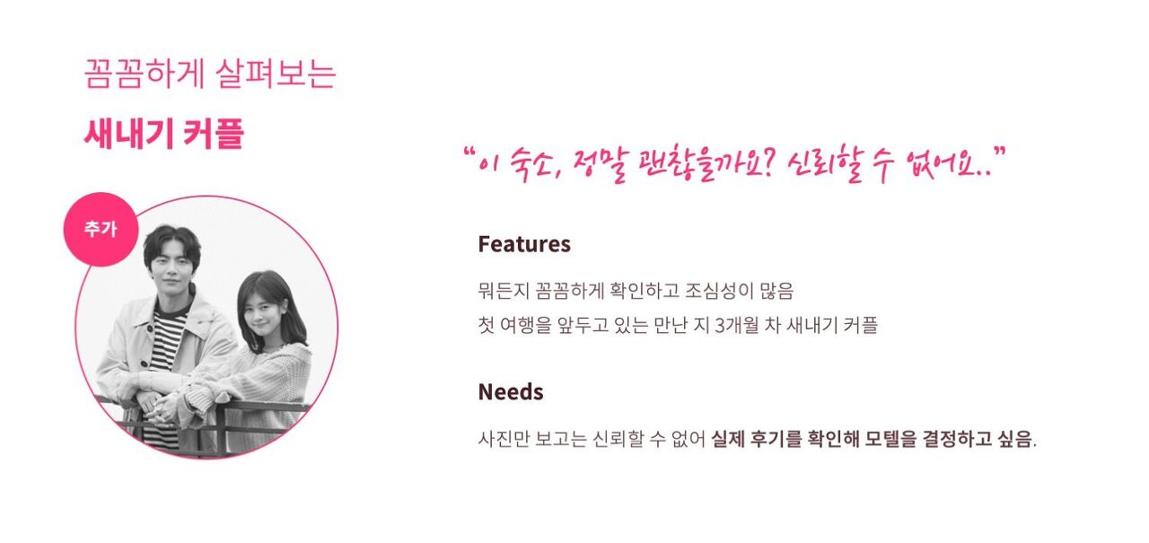 이들은 모텔 앱에서 종합 숙박 앱으로 이미지 개선을 꾀하고, '개인'이 사용하는 것에서 '가족'이 함께 사용할 수 있는 방향으로 Persona를 확장했다.