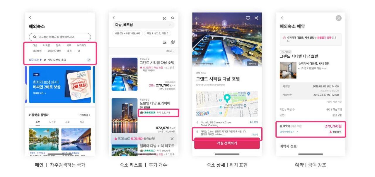 자주 검색되는 여행지를 메인 화면에서 노출시켜 검색 절차를 간소화했으며, 해외 숙소 검색 시 연박 전체 금액과 1박당 가격 등 세금 포함 금액을 바로 보여줘 사용자가 결제 단계에서 예상보다 큰 금액을 맞닥뜨리는 당황스러운 경험을 줄였다. 뿐만 아니라 믿을 수 있는 업체(트립어드바이저)의 후기와 그 개수를 보여줘 리스트에서 보이는 숙소에 대한 신뢰를 높였다. 숙소 정보 역시 위치는 가까운 관광지와의 거리를 비교해 보여줘 사용자가 직접 지도를 켜 위치를 확인할 귀찮은 일을 제거했으며, 금액과 연관된 정보를 강조해 보여줘 주목도를 높이는 방식으로 디자인을 개선했다.