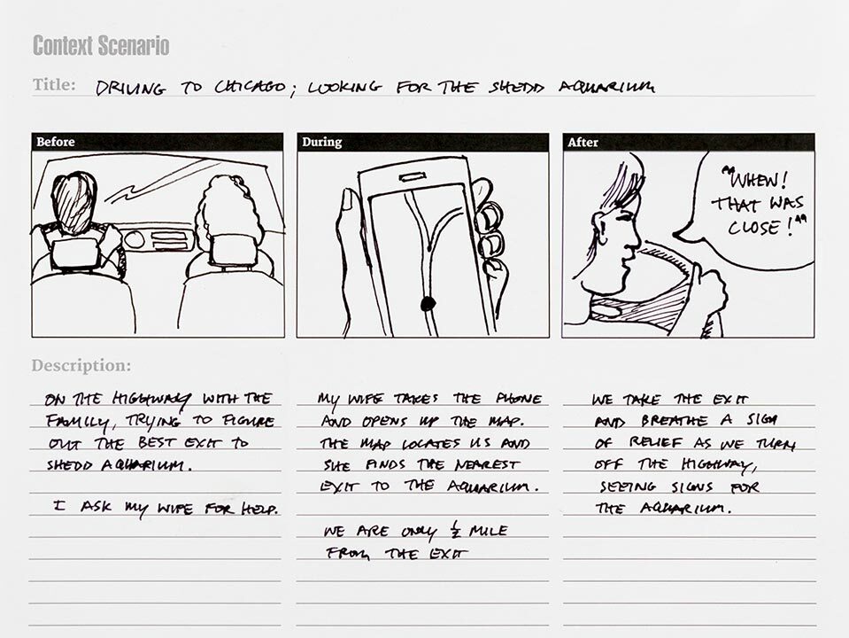 '디자인 과정에서 시나리오는 ‘이렇다면 어떨까?’라고 끊임없이 자문하게 하고, 창의적인 디자인을 제공해 준다. 동시에 가능한 대안을 구체적으로 설명하는데 매우 효과적이다. 시나리오를 적용하면 제품에 어떻게 표시될지 미리 예상해 볼 수 있다. 시나리오 기반 디자인(Scenario based design)은 디자인 프로젝트를 수월하게 진행할 수 있도록 힘을 불어넣는 강력한 기법이다.'