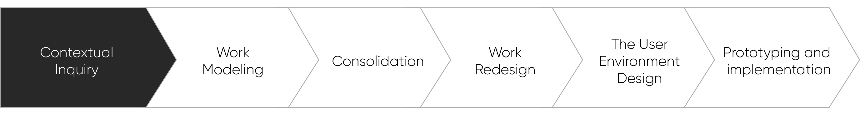 컨텍스추얼 디자인의 프로세스는 다음과 같다. 앞으로 프로세스에 맞추어 하나하나 스터디해 갈 예정이다. (UX디자인의 가장 기초는 방법론의 기초를 잘 이해하는 것이기에, 2021년 동안 놓쳤던 많은 방법론을 공부해볼 예정이다.)