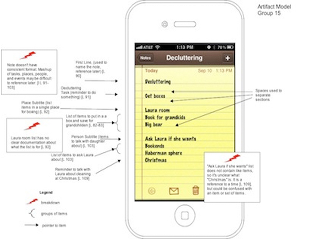 - 종류별로 분류하고, 시퀀스를 정리하지 않더라도 정리된 시퀀스를 설명하기 위해서 대표적인 아티팩트 이용한다. - 중요한 아티팩트를 디지털카메라로 찍어서 어피니티 다이어그램에 붙여놓는 것을 고려한다. |