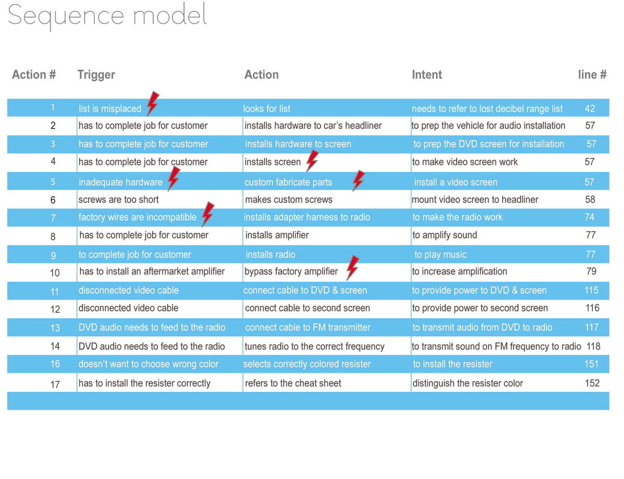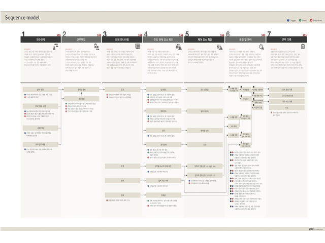 - 컨텍스추얼 인터뷰에서 관찰 또는 회상된 직무를 단계적으로 기록 - 완성된 시퀀스는 사용자가 업무를 완수하고자 관여하는 핵심 전략과 활동을 보여줌. |