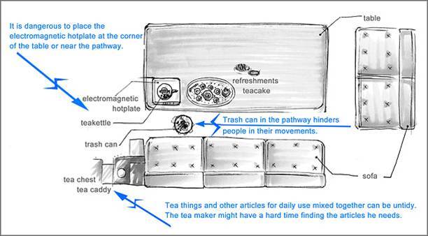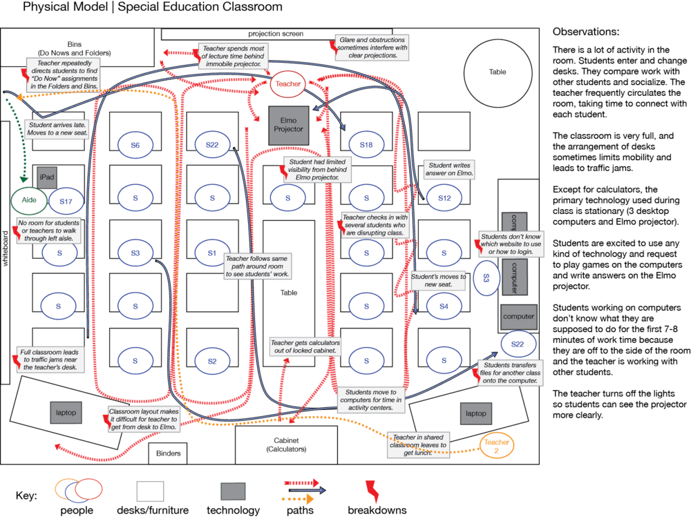 건물, 방의 구조, 원격지, 물리적 공간 전체의 문제점등을 보여준다. 사용자에게 주어진 물리적 환경에서 기회와 장애물이 무엇인지 밝혀낸다.