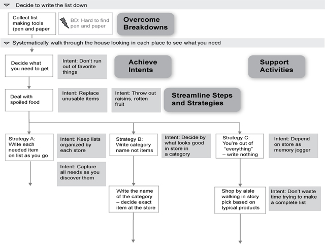 ③ 의도 Intent : 사용자가 직무나 특정 단계를 행하는 의식적이거나 무의식적인 이유 의도를 더 많이 정의할수록 디자인을 위한 더 좋은 결과를 가져옴. (한 업무에서 여러 종속적 의도가 있을 수 있음)