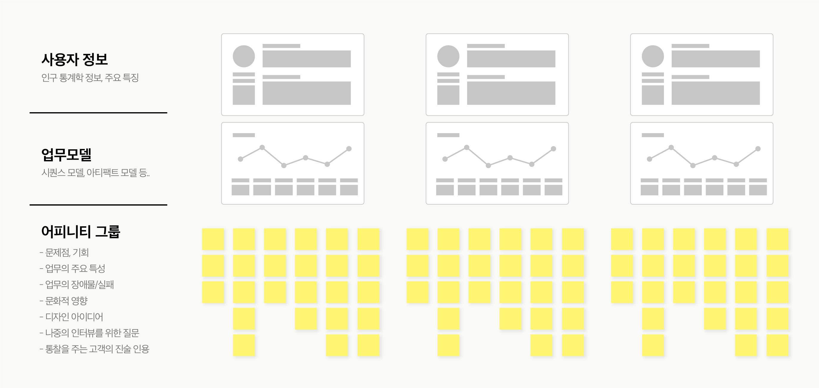 - 그룹에 노란색 포스트잇이 너무 많거나 파란색 라벨이 너무 일반적이라면, 잘 구축된 어피니티는 아니다.