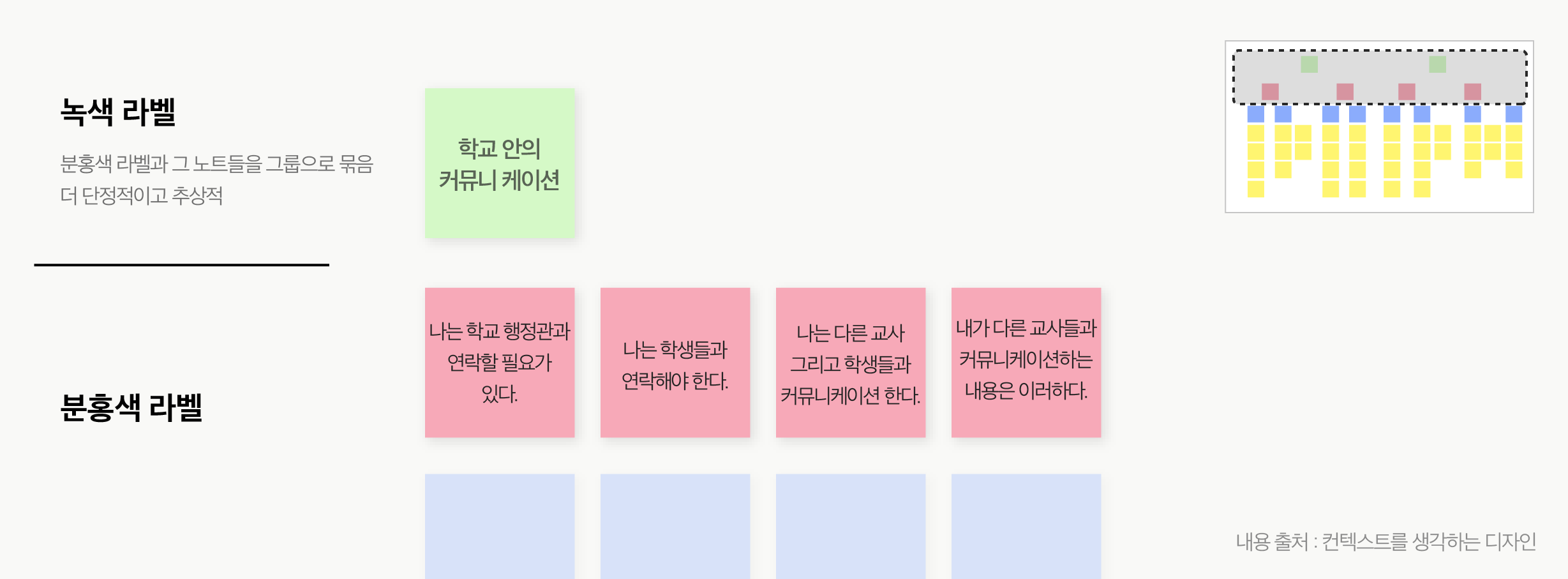 - 흔히 파란색 라벨은 너무 추상적인 수준이 되기도 하는데, 너무 많은 포스트잇을 특성화하려고 하기 때문이다.