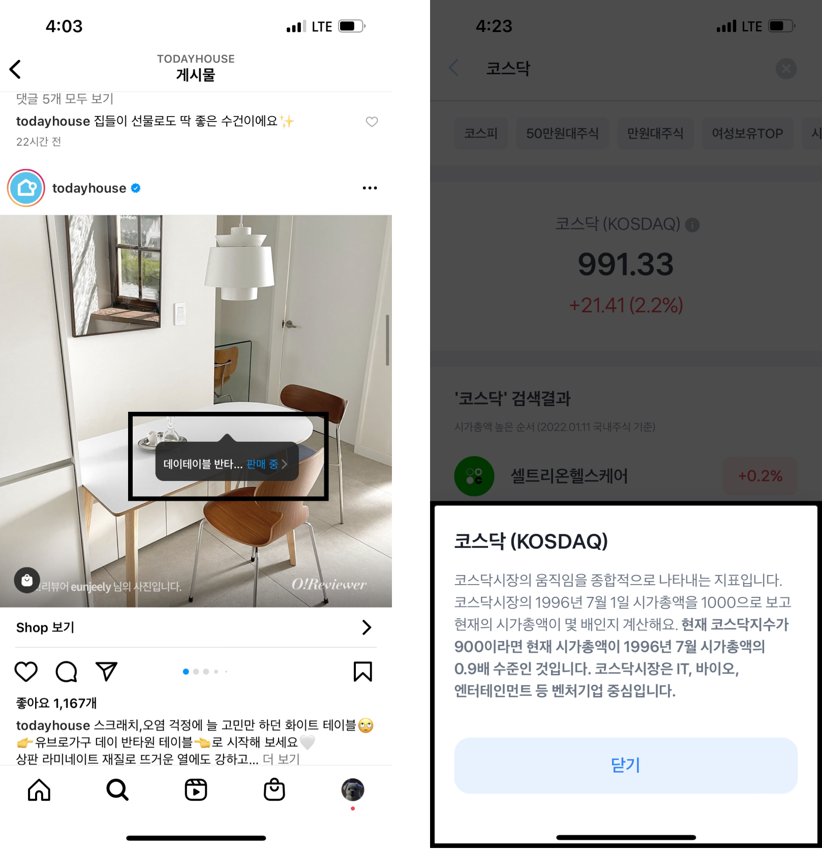 세 번째 형태의 레이어링은 사람들이 읽고 있는 페이지가 사라지지 않게 하는 것이다. 부가적인 정보들은 현재 떠있는 창 위로 작은 윈도우 창을 띄우거나, 롤오버로 보여준다. 인스타그램 스토어는 상품을 이미지와 함께 볼 수 있는 태그를 제공하고 있다. 토스 증권은 주식 초보자를 위한 주식 관련 정보를 설명해주기 위해 시트(Sheet)를 제공한다.