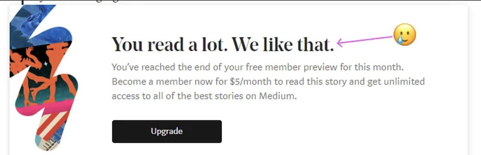이번에는 미디엄의 사례인데요, 아래 보이는 모달의 목적은 계정 업그레이드를 요청하는 것입니다. 그런데 모달 헤더를 볼까요? "당신 정말 많이 읽었네요. 정말 좋아요. (You read a lot. We like that.)"라니..
