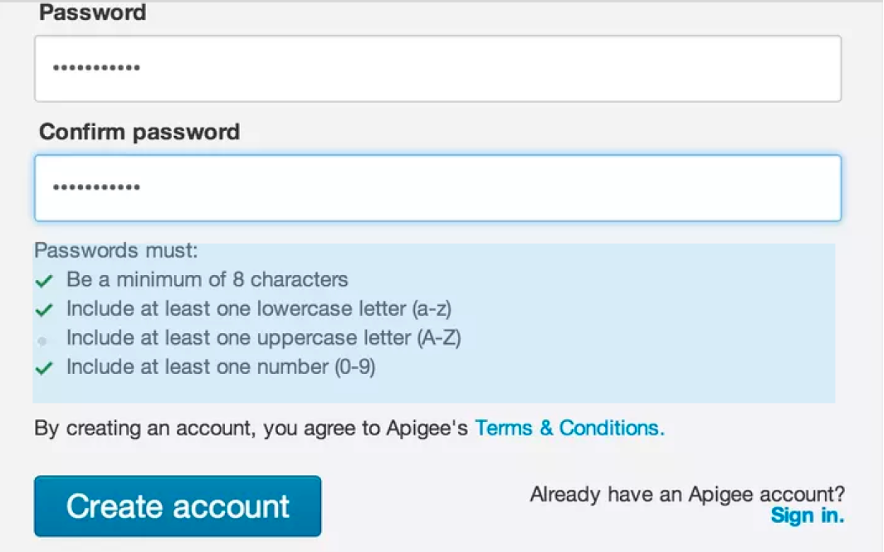 아래 사례는 적합한 비밀번호를 입력할 수 있도록 'Passwords must'를 가이드하고 있어요.