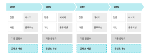 UX 라이팅 혹은 콘텐츠 전략 분야에서 Flow에 적합한 정보를 적절히 제공하기 위해 콘텐츠 맵핑 방법(Content Mapping Method)이나 웹 플로우 맵핑 방법(Web Flow Mapping Method)을 아이데이션 도구로서 사용하곤 합니다. 두 가지 모두 서비스 기획자가 어떤 정보를 제공해줘야 할지 작성하는 방법으로, 맥락에 맞는 대화형 UX 라이팅을 작성하는 데 효과적입니다. 또한, 사용자 여정 지도와 유사한 형태를 띠는데, 각 플로우에서 사용자 과업이 무엇인지, 인터페이스에서 액션 해야 하는 부분은 어디인지 등을 살펴봄으로써 필요한 전략을 세울 수 있습니다. 전자가 사용자의 질문과 과업을 기반으로 UX 라이팅을 설계한다면, 후자는 과업 별 사용자가 해야만 하는 행동과 사용자의 감정을 중심으로 플로우와 UX 라이팅을 살펴본다는 차이가 있어요.