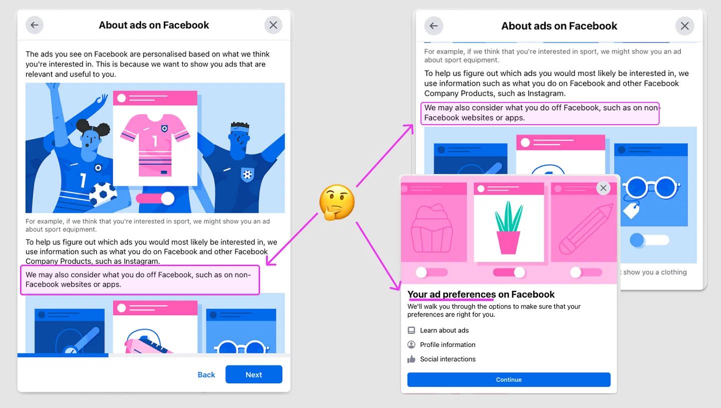 Facebook과 같은 소셜 미디어 웹 사이트에서 너무나 쉽게 찾아볼 수 있는 다크 패턴입니다. SNS는 광고 상품을 위해 사용자의 검색 등 활동 테이터를 추적하기 위해 사용자 동의를 받아야 하는데요, 페이스북은 부드럽지만 모호한 대안을 위해 '추적(Tracking)' 대신 개인화 광고(Personalised Ads)라 부르고 있습니다.
