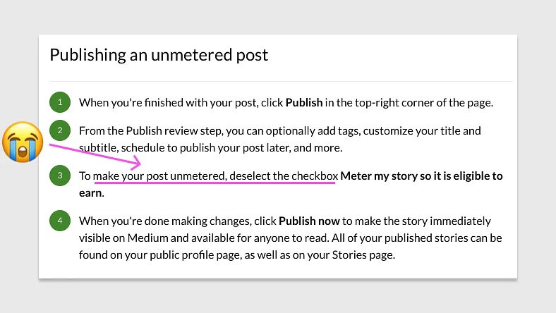 이중 부정은 사용자를 지독히도 헷갈리게 만드는 문장인데요, 역시나.. 또 미디엄은.. 이중부정문을 통해 고의적으로 혼란을 주네요. (이쯤 되면.. 하지 말라는 건 다하는 서비스가 아닐까...) Plainlanguage.gov 역시 명확하고 이해하기 쉬운 언어를 위해 이중 부정적 진술은 피해야 한다고 가이드합니다.