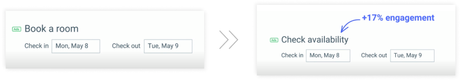 너무나도 유명한 Google IO17에서 발표된 Google 사례에 따르면, 다음 단계를 명확히 하는 마이크로카피 작성함으로써 17% 참여도 증대했다고 합니다. "Book a room"에서 "Check availability"라고 타이틀(Title)만 바꾼 성과였죠.