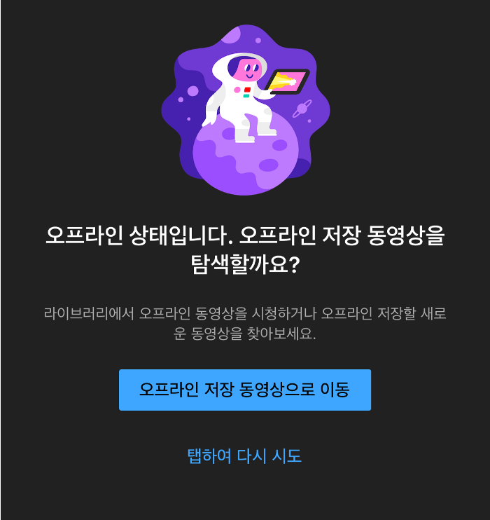 유튜브(Youtube)는 오프라인 상태로 서비스에 접근했을 때 '재시도 BT(복구할 수 있는 액션)'과 '오프라인 저장 동영상으로 이동 BT(다른 콘텐츠 제공)'을 제공했어요.