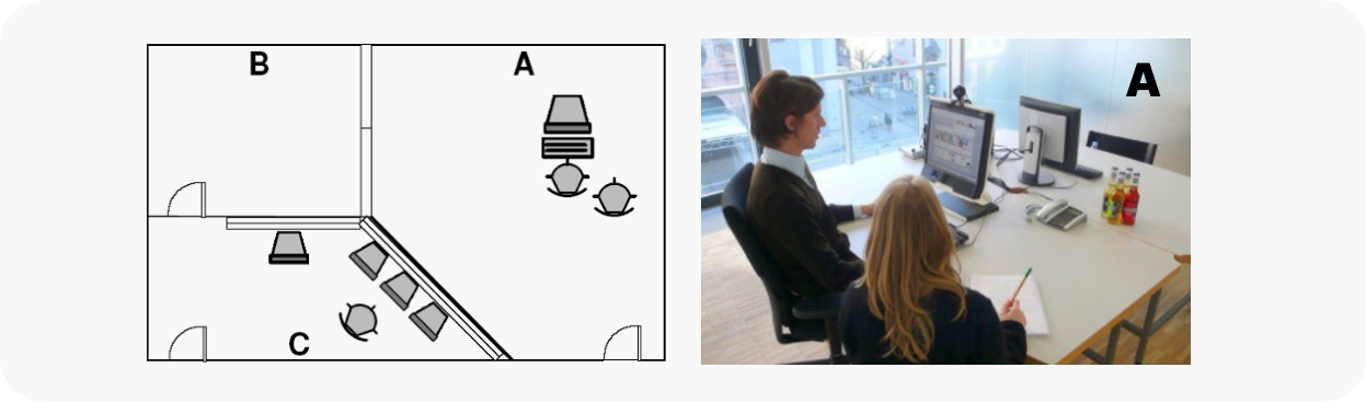 - A에서 사용자와 연구원은 비디오카메라와 마이크가 설치된 지정된 테스트 룸에서 테스트 수행 (모두 PC 앞에 앉아 테스트 수행)