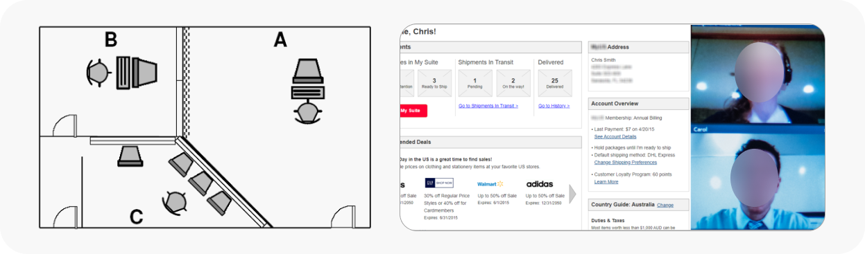 - 연구원은 룸 A, 사용자는 룸 B에 따로 있으며 웹캠과 오디오 연결을 통해서만 통신이 가능)