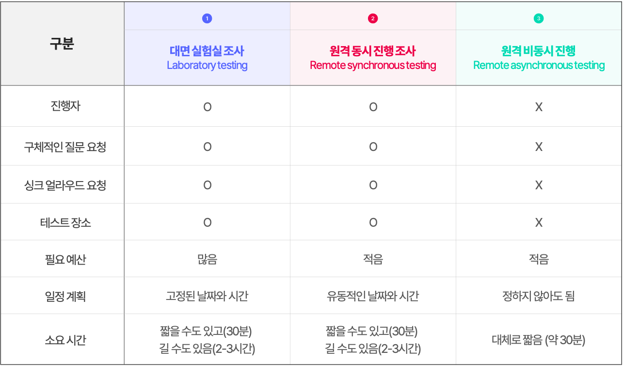 UT는 수집 데이터 유형에 따라 🅐 정량 UT, 🅑 정성 UT / 진행 방식에 따라 ❶ 대면실험실 조사(Laboratory testing), ❷ 원격 동시 진행 조사(Remote synchronous testing), ❸ 원격 비동시 진행 조사(Remote asynchronoustesting)로 나눌 수 있다.