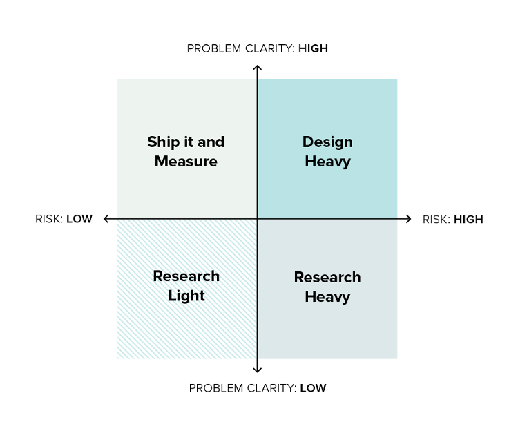 연구원들이 다양한 상황에서 시간과 에너지에 집중하도록 안내할 수 있는 2x2 매트릭스를 개발된 [Jeanette Fuccella - A matrix for prioritizing user research]를 기준으로 설명하자면, Design heavy영역과 Research heavy영역으로 설명할 수 있을 것이다.