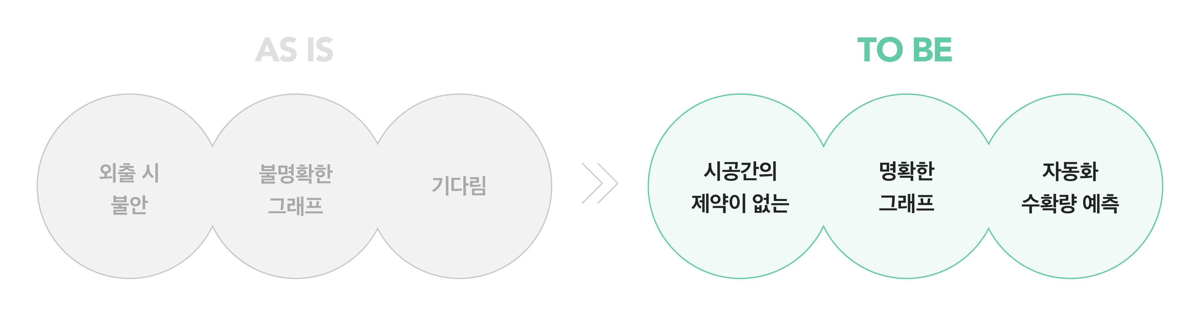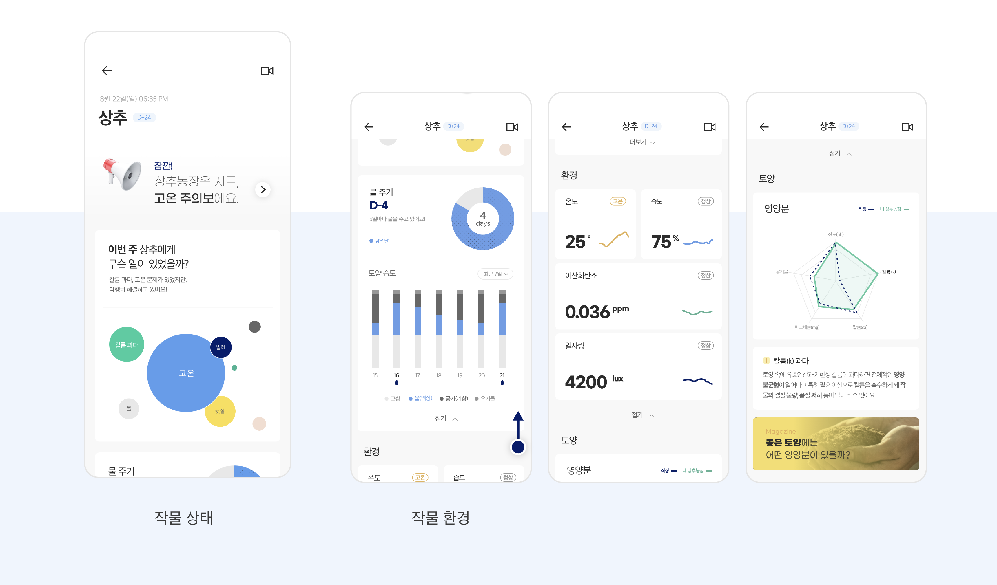 작물에 대한 실시간 정보와 다양한 데이터를 제공하여 더 나은 작물 생산에 도움을 줍니다.
