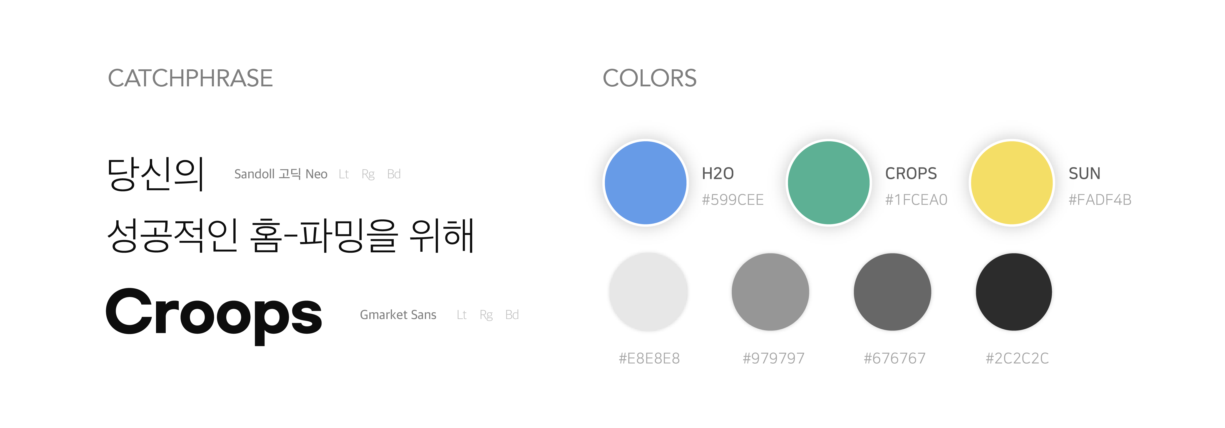 성공적인 홈 파밍을 위한 물을 상징하는 블루, 태양을 담은 옐로 컬러와 작물을 상징하는 그린을 메인 브랜드 컬러로 사용하였습니다.