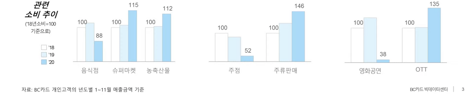 코로나 19 이후 음식점 소비는 감소했지만, 식료품 구입을 위한 슈퍼마켓, 농축산물 소비가 증가했으며, 홈쿡을 돕는 주방가전의 소비가 증가했다.