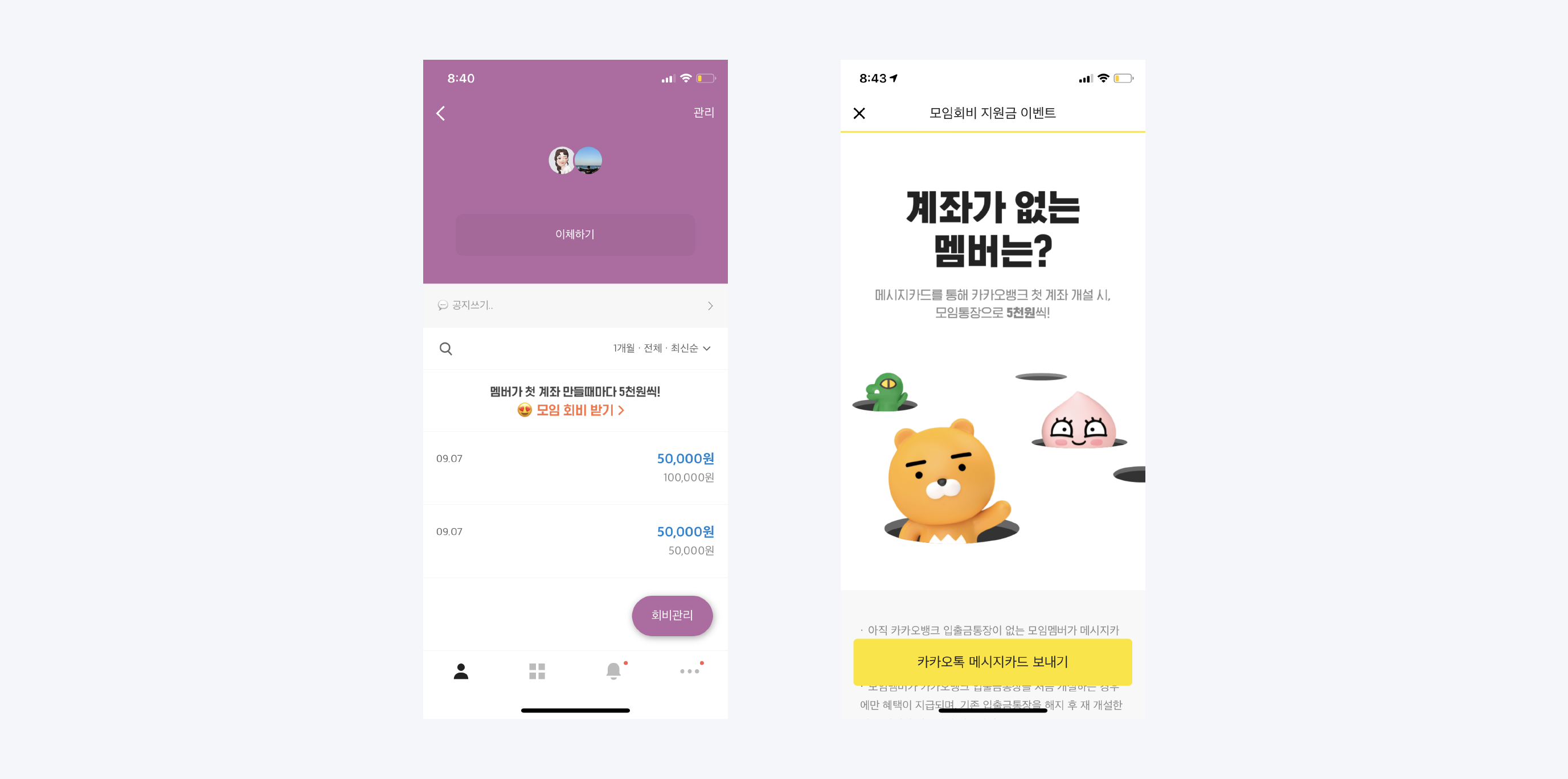 카카오 뱅크의 모임통장은 기존의 공유 통장과 다르게 모임통장 내에 초대된 모든 회원들이 실시간으로 입/출금 내역을 확인할 수 있게 해 준다. 여기서 회원을 초대하는 것은 특별한 보상을 바라는 행동은 아니다. 본 목적대로 사용하기 위해 자연스럽게 거치는 과정일 뿐이다. 실제 카카오 뱅크 모임통장의 이용자 30%는 별도의 카카오뱅크 계좌가 없는 신규 사용자인 것으로 알려졌다.