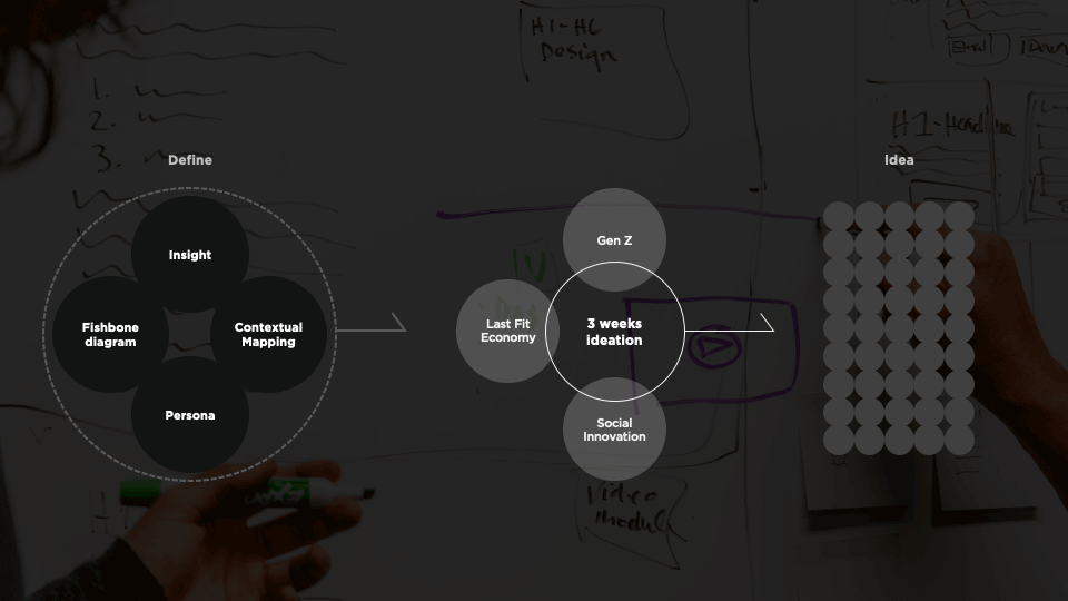 Define 과정에서의 Insight, Fishbone Diagram, Contextual Mapping(혹은 Behavior Mapping), Persona를 기반으로 총, 80여 개의 아이디어를 도출했다. 브레인스토밍, 브레인 라이팅, 여러 번에 걸친 회의를 통해 얻어낸 아이디어였다. 그중 한 가지 아이디어를 선택해 구체적인 컨셉으로 구체화시켰다. 세 가지 주제에 적합하게 적용되며, 우리의 인사이트를 잘 담아낸 컨셉 CUE를 소개하고자 한다.