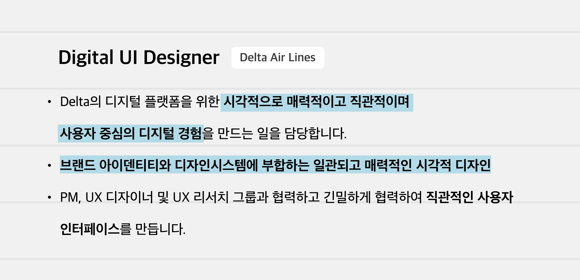 Delta 항공의 디지털 UI 디자이너 채용 공고에서도 비슷한 역할과 책임(Resoponsibiblity)에 대해 작성되어 있었다. 브랜드 가이드라인에 맞추어 일관된 유저 인터페이스와 인터랙션을 설계하는 역할. 이어서 다루게 될 UX 디자이너나 프로덕트 디자이너와 달리 비주얼적인 역할에 초점을 맞추고 있다.